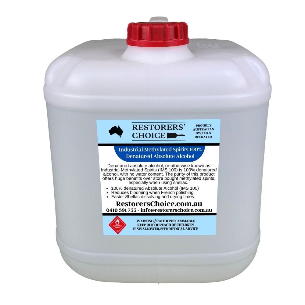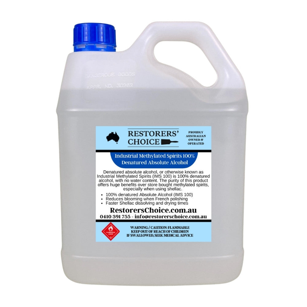 Denatured absolute alcohol, or otherwise known as Industrial Methylated Spirits (IMS 100) is 100% denatured alcohol, with no water content. The purity of this product offers huge benefits over store bought methylated spirits, especially when using shellac. Benefits include, faster dissolving times of shellac flakes, faster drying French polish, and reduced chances of blooming.