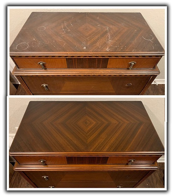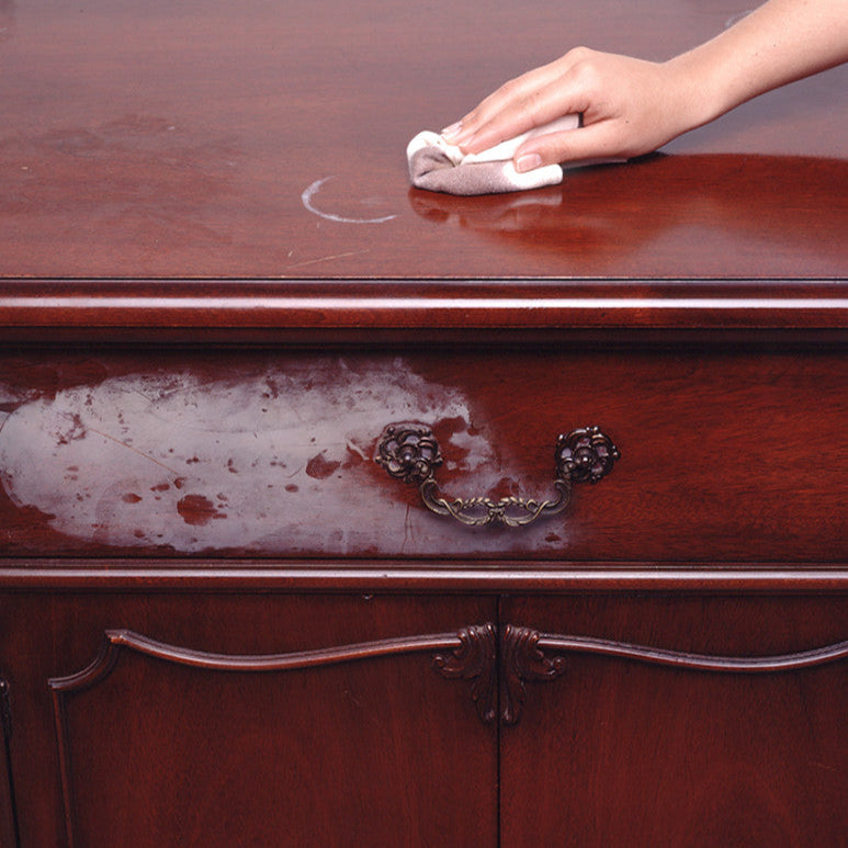 With a simple wipe-on, wipe-off process, most finished wood surfaces that seem to need a refinishing job can be completely restored in a few minutes. White heat rings and water marks, sun fade, oxidation, smoke damage, and most other blemishes can be quickly eliminated. Before you go to the extreme of stripping it, try restoring it!